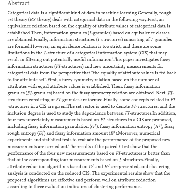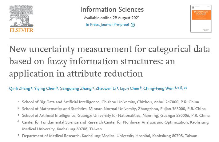 近日,公司张钦礼教授的论文“New uncertainty measurement for categorical data based on fuzzy information structures: an application in attribute reduction”发表在计算机科学领域国际顶级期刊《Information Sciences》上,该期刊为中科院分区表中一区Top期刊,2020年影响因子为6.7953。