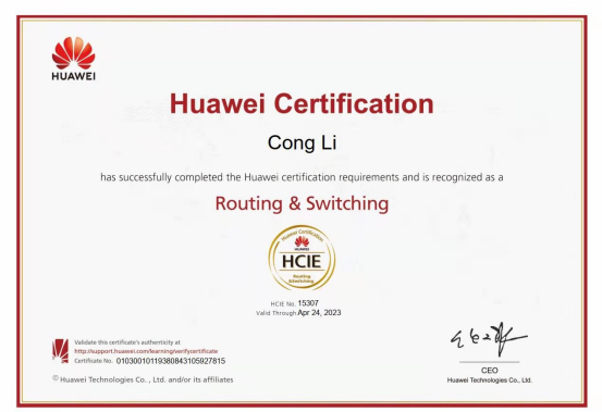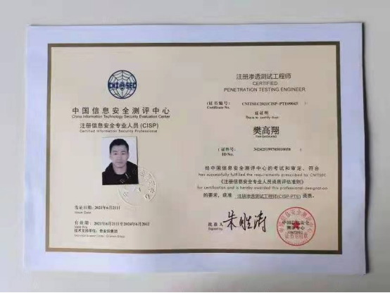 公司近年来非常重视专业水平认证工作的开展,以“计算机网络”教学团队为主导,积极支持和引导员工在校期间取得1-2项国家级专业水平或行业领军企业认证,并取得了一定成绩。2021年里,樊高翔等4名同学获得CISP-PTE(注册信息安全专业人员--渗透测试工程师)认证,李聪等4名同学获得HCIE(华为ICT专家级)认证,王爱宏等29名同学获得HCIA(华为网络工程师初级)认证。此外,院部还大力支持教师申请专业水平认证证书,如2021年8月,“计算机网络”教学团队的骨干教师陈念、杨利顺利通过CISP相关认证考试。