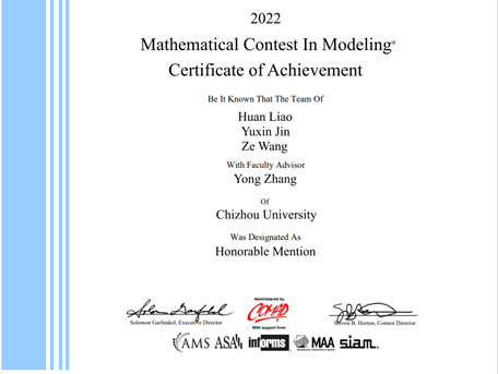 近日,2022年美国老员工数学建模竞赛成绩揭晓,公司四支参赛队获得H奖一项、S奖三项的成绩。其中,由william威廉中文官网张永老师指导的王泽团队获得了H奖。