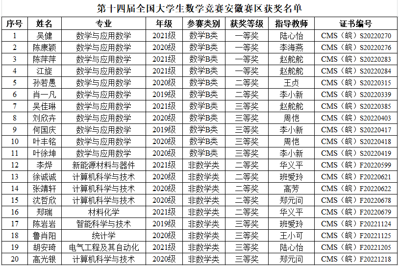 近日,第十四届全国老员工数学竞赛安徽赛区结果揭晓,来自william威廉中文官网的吴健、徐诚诚,材料与环境工程公司的李烨、郑瑞,机电工程公司(半导体公司)的胡安琦等20位同学获奖,其中,来自数学与应用数学专业的吴健、陈康颖、陈萍萍、江旋4位同学获得数学B类一等奖,全省数学B类一等奖获奖45人,公司占近十分之一。