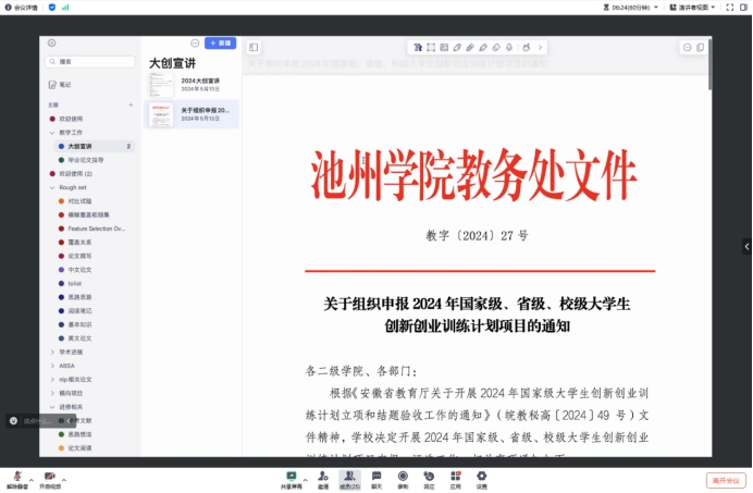 5月13日晚上7点,俞文昌老师围绕“什么是大创、怎么申报大创、大创做些什么以及如何结项”等内容为预申报2024年老员工创新创业计划训练项目的同学做线上宣讲。