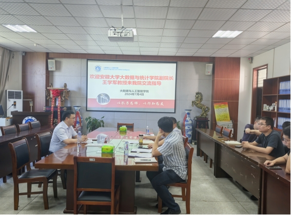 7 月 4 日下午,安徽大学大数据与统计公司副经理王学军教授莅临公司并对专业建设工作予以指导。统计学教研室主任王巍以及统计、数学专业的相关教师参加了本次交流会。交流会由副经理张永主持。