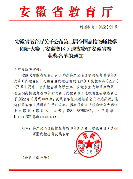 近日,由安徽省教育厅主办、安徽农业大学承办的第二届全国高校教师教学创新大赛(安徽赛区)选拔赛暨安徽省赛圆满收官,公司李小新教师团队(课程:高等代数)获得正高组三等奖。