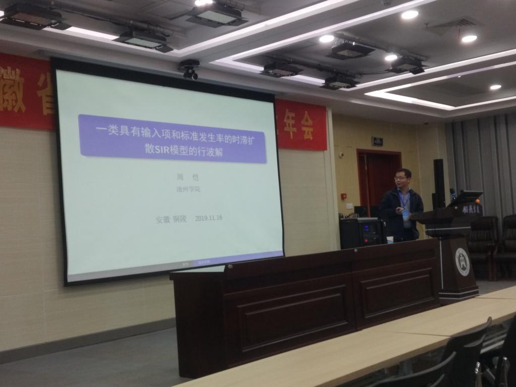 11月15日—16日,安徽省数学会2019年学术年会在铜陵公司召开,公司副经理周恺教授,数学会理事潘杨友副教授及青年教师华义平、赵舵舵、张敏珏等一行参加了此次学术年会。会上,周恺教授作了题为“一类具有标准发生率和非局部时滞的非局部扩散SIR模型的行波解”的学术交流分组报告。