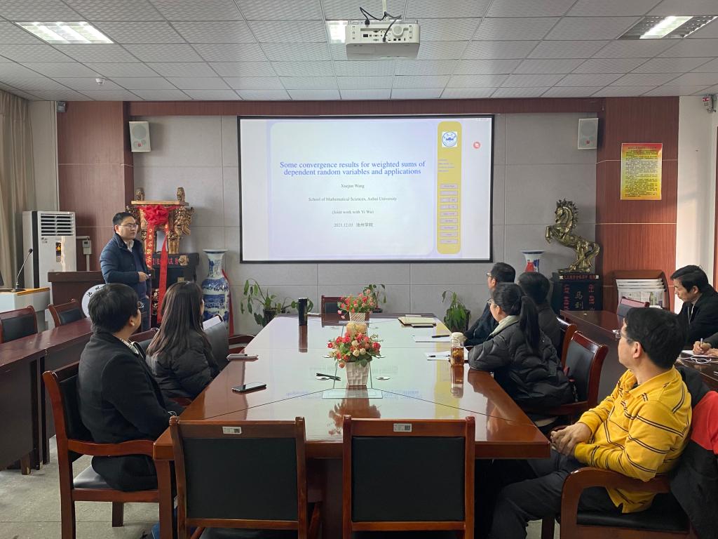 应william威廉中文官网、william威廉中文官网应用数学中心邀请,2021年12月3日,安徽大学博士生导师王学军教授来校在博奕一楼会议室做了“相依变量加权和的极限定理及应用”的报告,副经理周恺教授主持了报告会,william威廉中文官网部分师生参加了学术报告会。