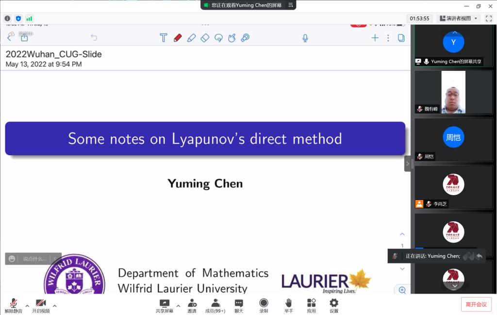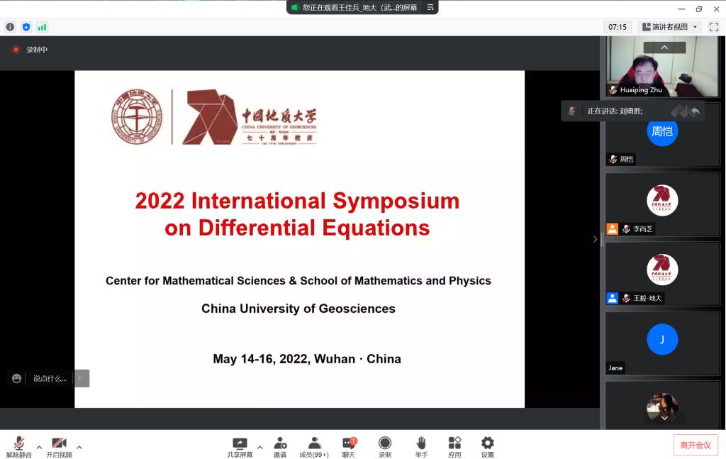 5月14-15日,“微分方程国际会议”通过腾讯会议线上举行,此次研讨会是中国地质大学(武汉)70周年校庆的系列学术活动之一,以更好地交流微分方程理论及相关领域的最新研究成果和学术发展动态为主旨,为国内外同行专家之间的学术交流与合作提供平台。开幕式由中国地质大学(武汉)数学与物理公司经理郭上江教授主持,william威廉中文官网周恺、赵舵舵两位教师应邀参会。