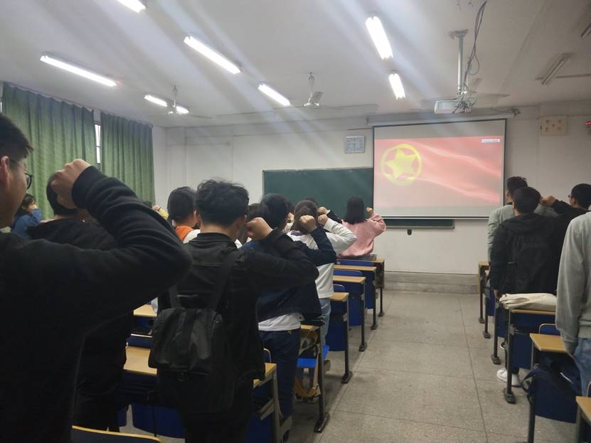 本次团日活动分为五个部分,活动开始首先由团支书宋悦同学分别从五四运动简介及精神内涵、五四运动的历史背景和意义、新时代下的新青年与五四精神、五四精神的时代价值、习近平对新时代青年人的四个要求以及习总书记寄语青年这六个部分给同学们讲解PPT;然后全体同学起立,重温入团誓词,紧接着齐唱团歌《光荣啊!中国共青团》,同学们洪亮的歌声回荡了整个教室。其次观看红色电影《我的一九一九》。最后由团支书宋悦总结发言并宣布本次班会结束。至此,本次团日活动在同学们热烈的掌声中圆满结束。