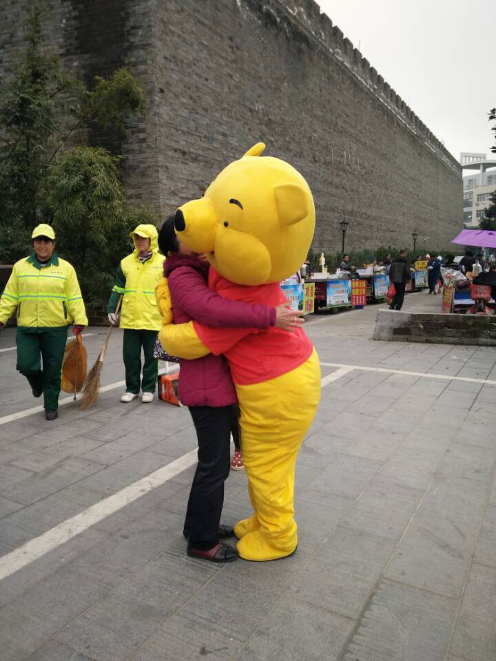 周六上午8点半,志愿者们在公司南门前集合,由领队分配志愿者在服务地点开展活动。在负责人张雪晴的带领下,活动井井有条地进行。部分志愿者在秀山门附近宣传活动内容,得到路人同意后,带领路人去活动地点,身穿玩偶服的志愿者再次得到路人同意后送上温暖的拥抱,最后志愿者对他们表示感谢并赠送小礼物。