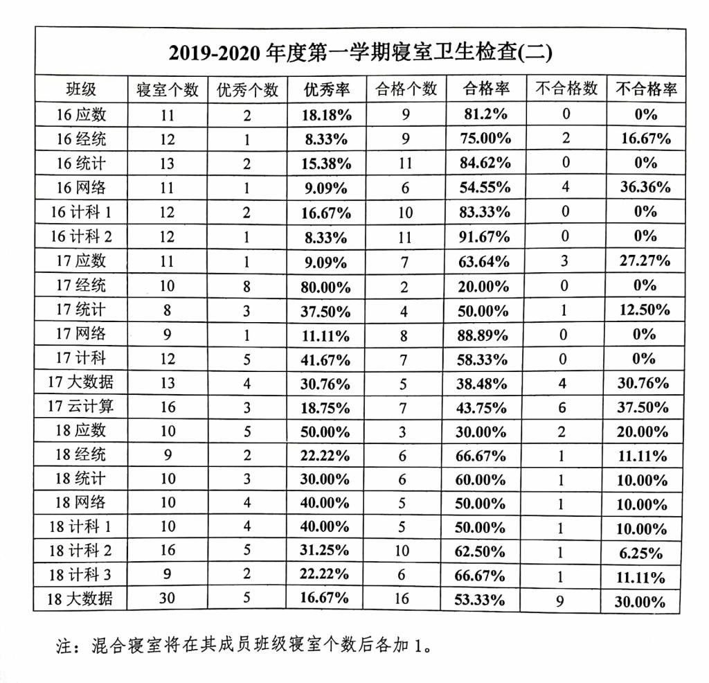(9)混寝:(18经统、18网络、18统计、18应数)桌面、地面摆放乱,床铺未整理。