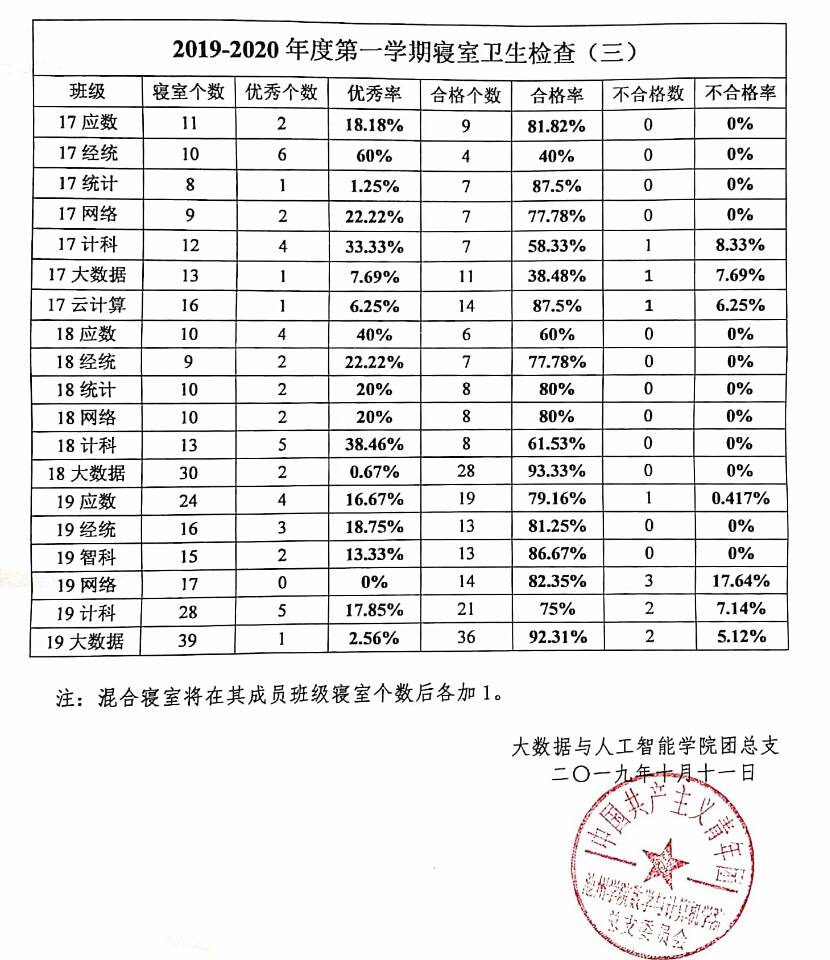 (1)19大数据存在垃圾桶不及时清理,床铺未叠,物品摆放不齐现象。19大数据辅导员要督促同学打扫卫生。