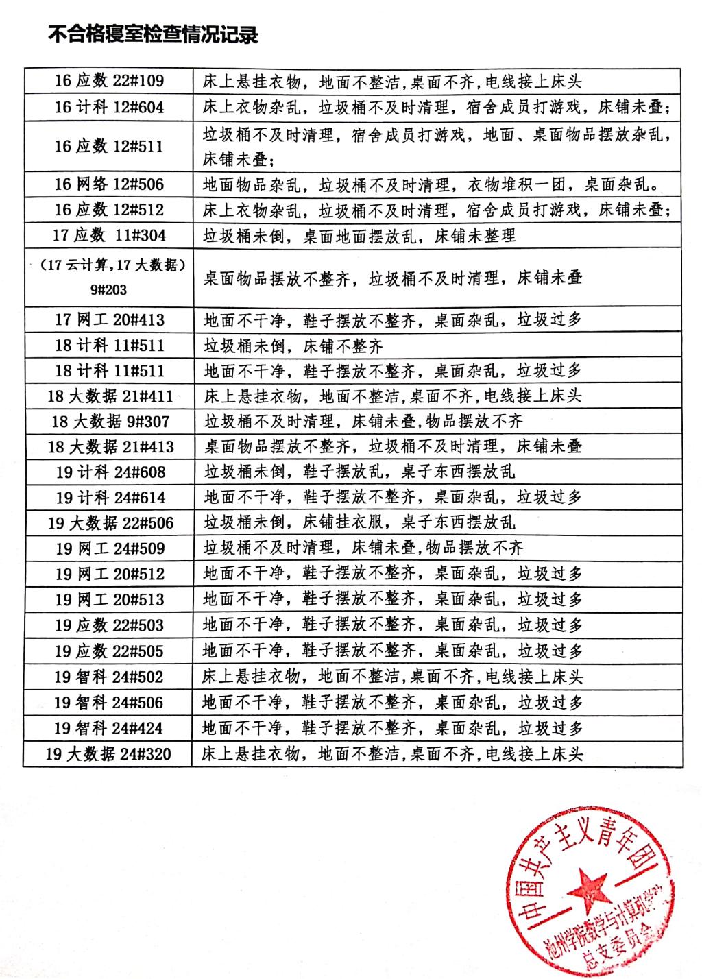 (3)17云计算与大数据混寝寝室存在地面不洁,垃圾未倒,床铺未叠,桌面物品杂乱现象。17云计算辅导员要督促同学打扫卫生。