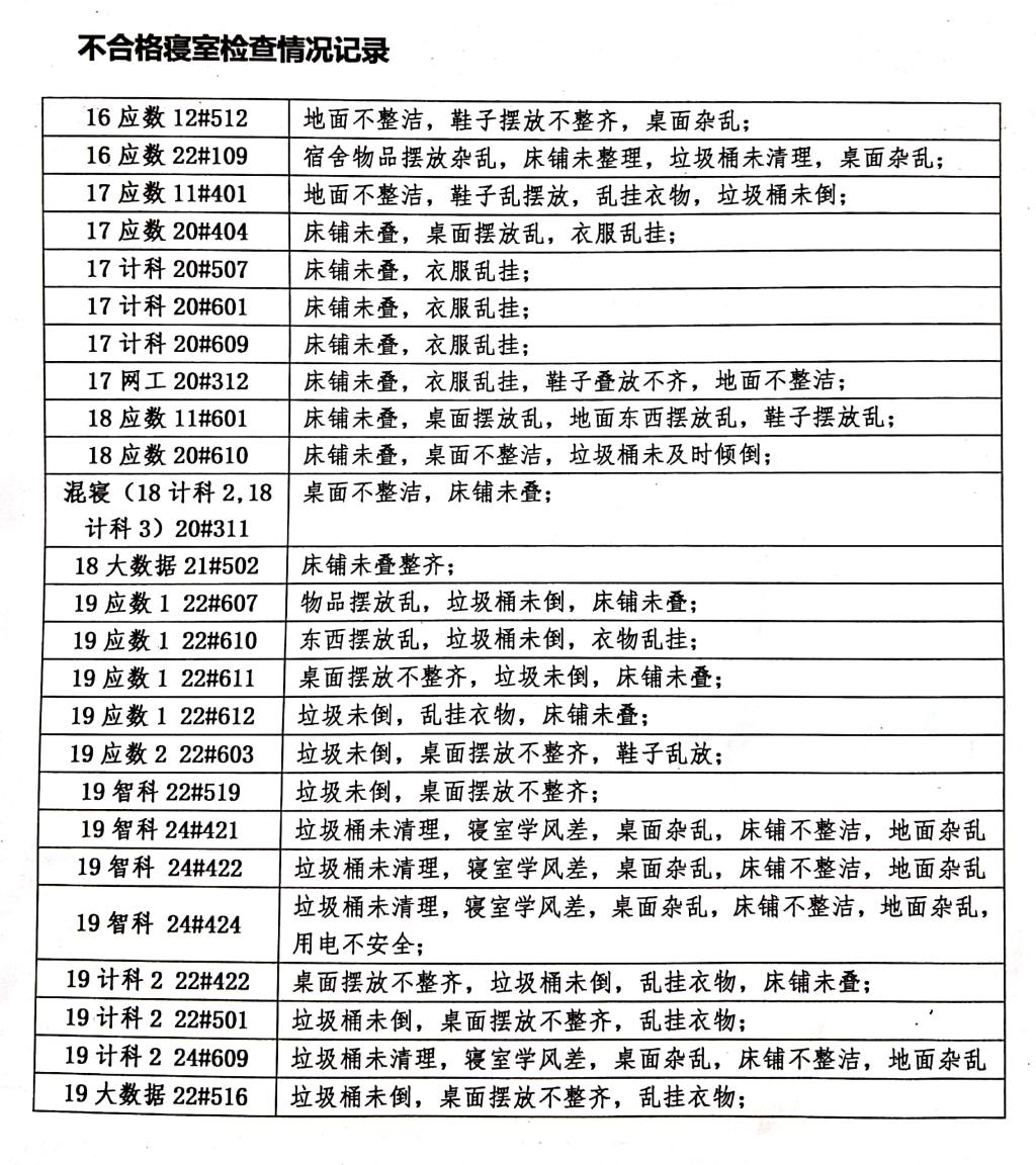 (6)19计科2存在桌面不整洁,垃圾桶未倒,乱挂衣物,床铺未叠,寝室学风差现象。辅导员要督促同学打扫卫生。