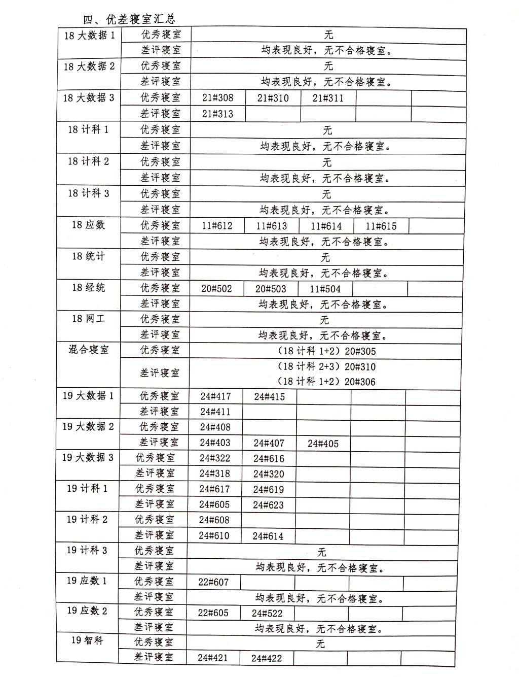 本次卫生检查20级问题寝室较多。请20级辅导员通知负责人加强寝室卫生安全的管理和学风的监督。