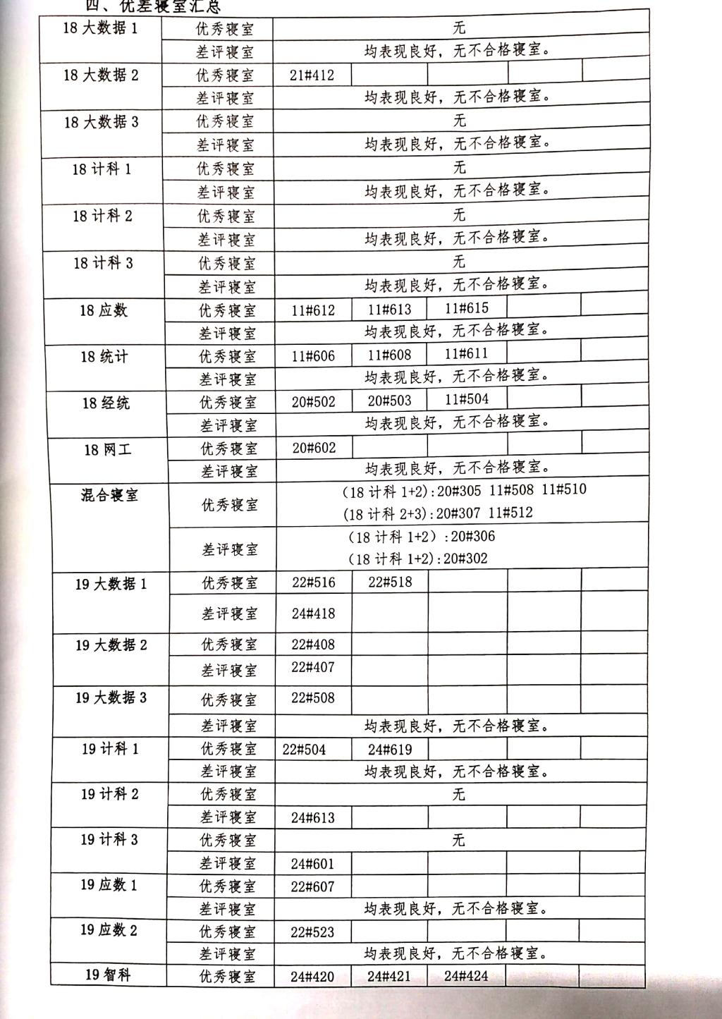 本次卫生检查20级问题寝室较多。请20级辅导员通知负责人加强寝室卫生安全的管理和学风的监督。