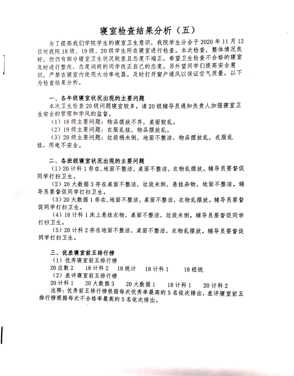 为了提高我们公司员工的寝室卫生意识,公司员工分会于2020年11月12日对公司18级、19级、20级员工所在寝室进行检查。本次检查,整体情况良好,但仍有部分寝室卫生状况较差且态度不端正,希望卫生检查不合格的寝室及时进行整改,态度消极的同学改正自己的态度。另外望同学们提高安全意识,严禁在寝室内使用大功率电器。及时打开窗户通风以保证空气质量。以下为检查结果分析。