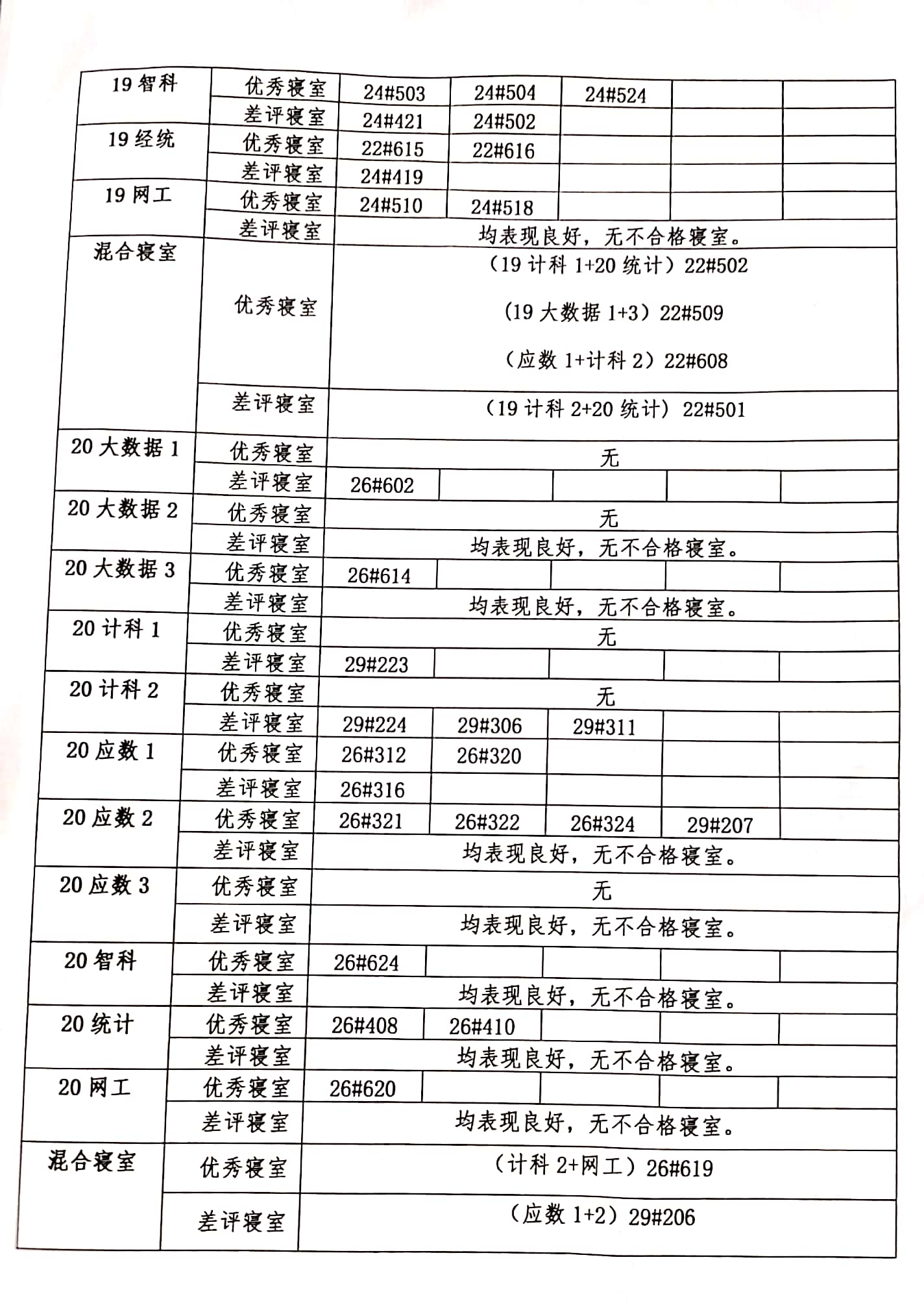 本次卫生检查20级问题寝室较多。请20级辅导员通知负责人加强寝室卫生安全的管理和学风的监督。