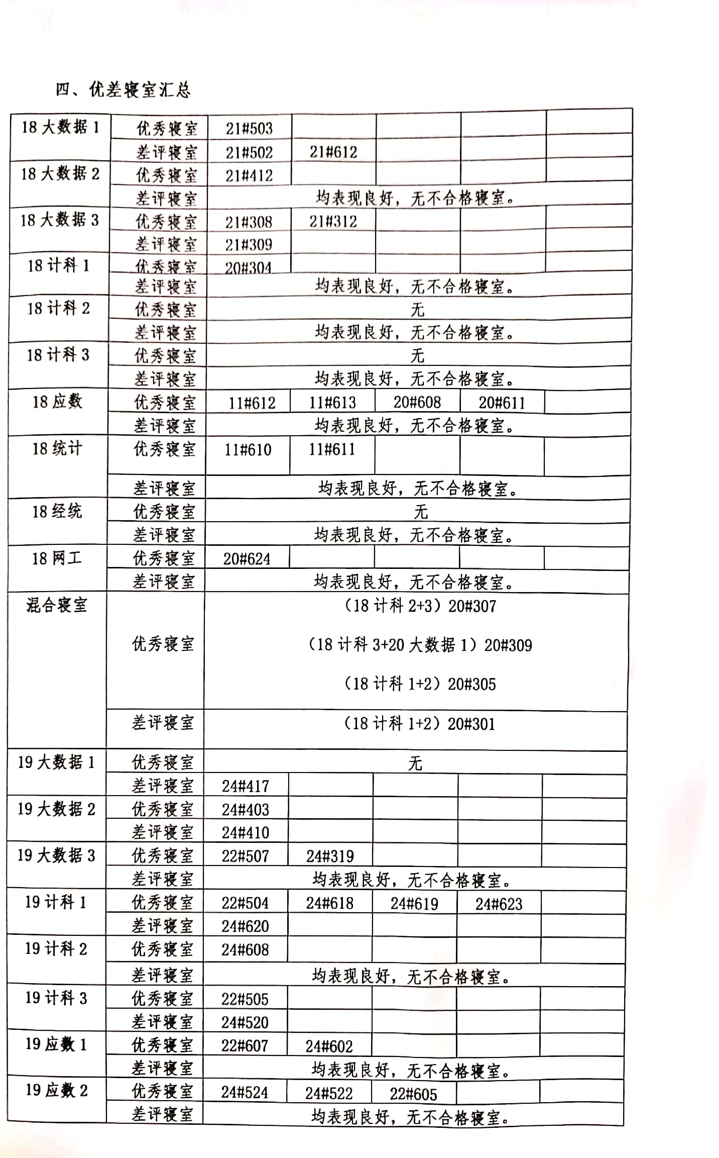 (4) 20应数1存在桌面不整洁,垃圾未倒。辅导员要督促同学打扫卫生。(5) 19大数据2存在地面不整洁,桌面不整洁,衣物乱摆放。辅导员要督促同学打扫卫生。