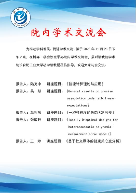 为推动学科发展、促进学术交流,定于2020年11月28日下午2点,在博奕南一楼会议室举办院内学术交流会,邀请公司学术经理,合肥工业大学胡学钢教授莅临指导,欢迎大家与会交流。