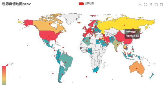 完成数据预处理后,利用pandas模块进行数据保存,将处理后的数据汇总并保存到本地csv文件;使用datetime模块获取当天的日期;基于pyecharts模块绘制数据可视化界面。pyecharts模块集合了柱状、折线、扇形及国内外地图等多种丰富的模块资源,不仅为程序员带来极大的操作便利,更利用自身的优势为用户提供更加舒适的视觉体验。