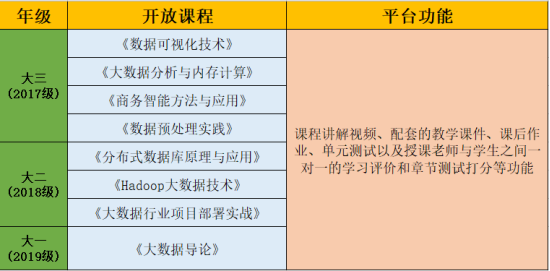 结合大数据专业在新学期的课程设计,曙光大数据公司老师分别针对自己所教授的课程,为同学们精心准备了整套的线上学习资源,便于各年级员工在寒假期间在线学习。面向大数据专业三个年级开放的具体课程如下:大三课程:《数据可视化技术》、《大数据分析与内存计算》、《商务智能方法与应用》、《数据预处理实践》;大二课程:《分布式数据库原理与应用》、《Hadoop大数据技术》、《大数据行业项目部署实战》;大一课程:《大数据导论》。